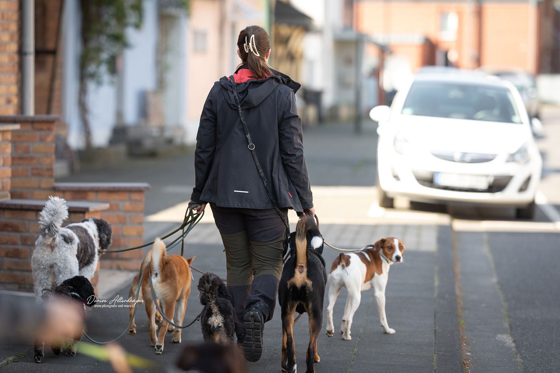 Wir gehen morgens zunächst einzeln mit den Welpen spazieren und später, wenn alle Hunde angekommen sind, in der Gruppe. Zudem gehen wir nach jedem Schlafen, Spielen und Essen mit den Welpen raus, damit sie sich lösen können und kein Malheur im Haus passiert. Dies trägt zum Lernverhalten der Stubenreinheit bei. Während der Spaziergänge üben wir die Leinenführigkeit und die Orientierung am Menschen.
